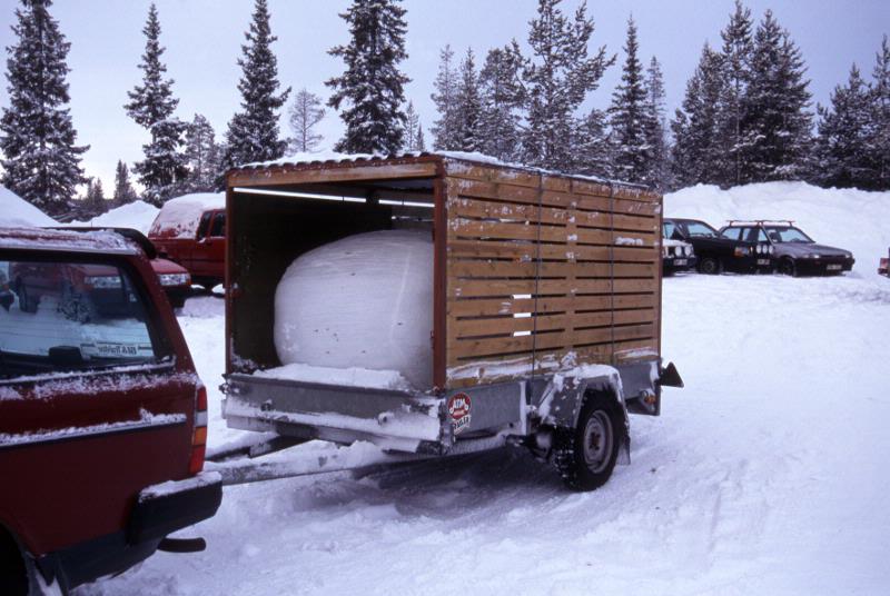 En rentransport vid renskiljning i Porjushagen. De vita bollarna inne i transporten är förpackad ensilage till renarna.