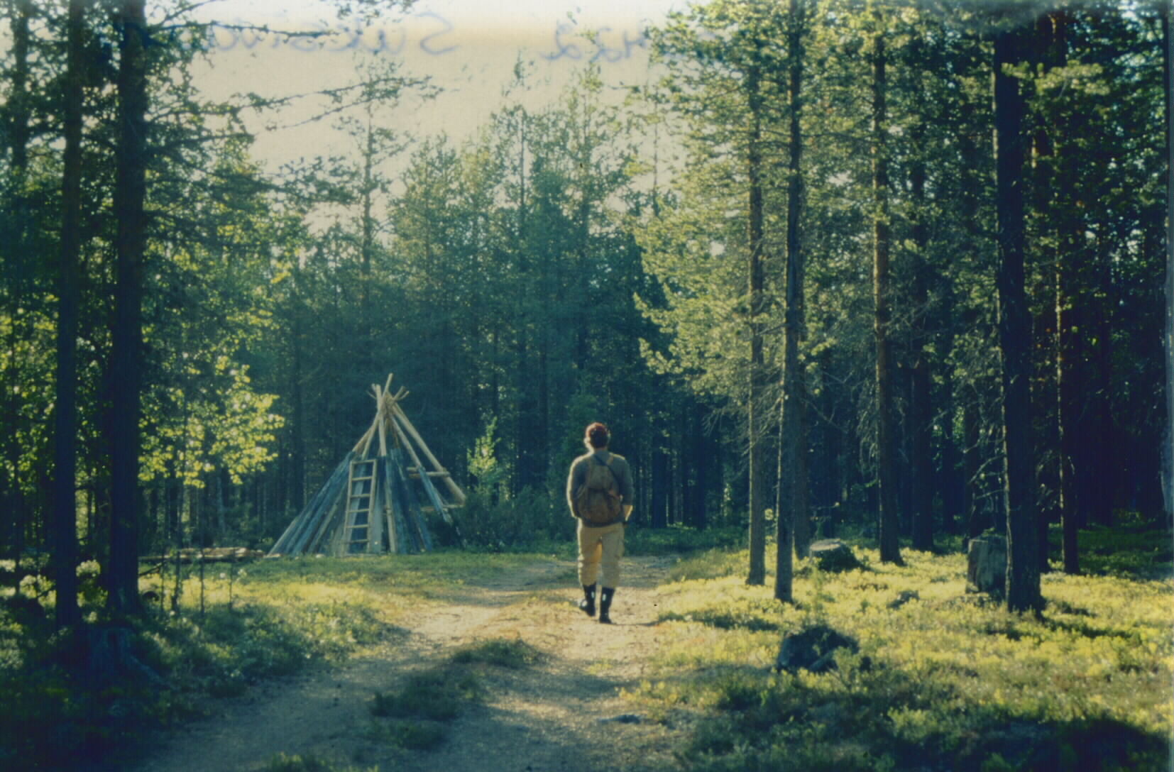 AJF:20:000422 :: skogsparti, stig, man, kåtaställning, byggnadskonstruktion