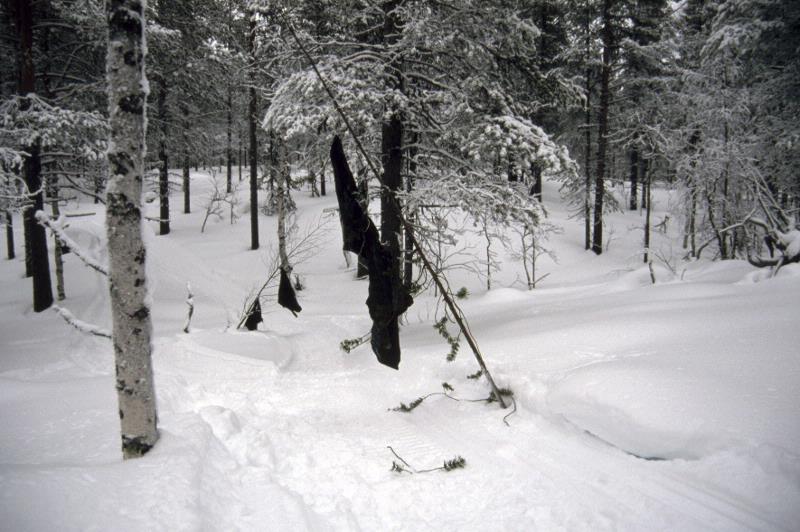 Skoterspåret i närheten av Koivo är avspärrat med hjälp av stora, svarta plastsäckar. Det för att renarna inte ska följa spåret.