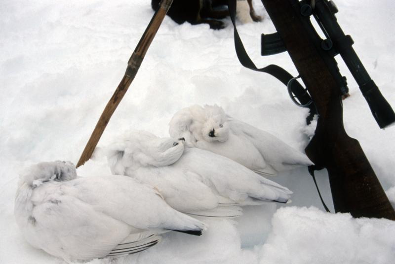 Nyskjutna dalripor. Vapnet som används vid ripjakt under vintertid heter Salongsgevär kal. 5,6 15 R.