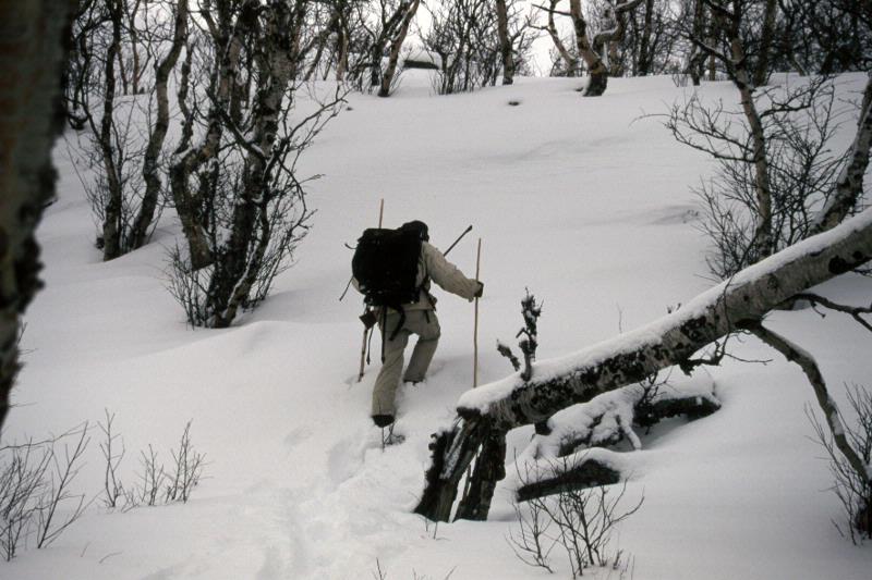 L:25:2000:3:0317 :: björk, ryggsäck, skidåkning, skog, snö, snöfordon, snöskoter, vinter