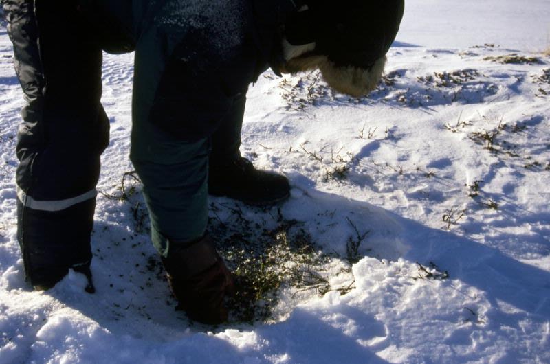 En man gräver med handsken för att kolla renbetet, vilket visar sig vara bra.