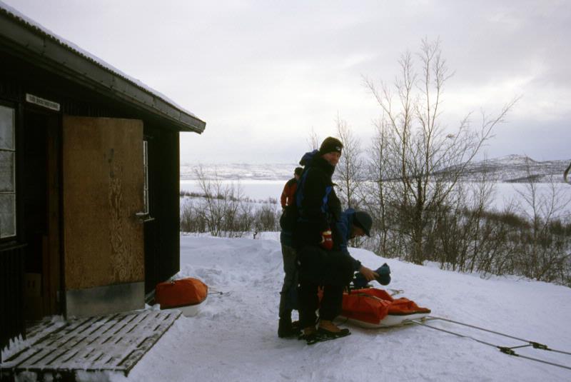 L:25:2000:3:0407 :: kälke, snö, stuga, turister, turiststuga, vinter