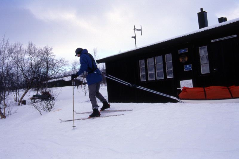 L:25:2000:3:0410 :: skida, snö, stuga, turister, turiststuga, vinter