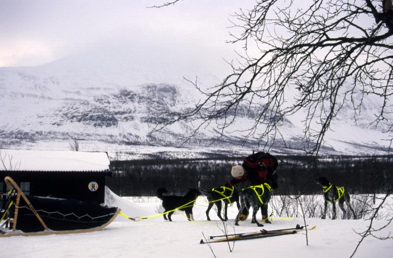 Hundspann på väg från Áhkkástugan. Hundföraren kopplar hundarna framför släden.