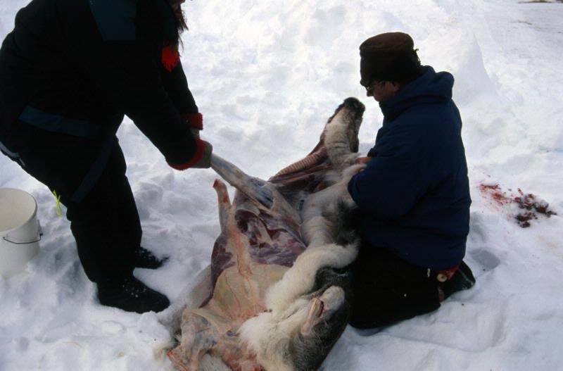 Skinnet på renens vänstra sida tas av med hjälp.