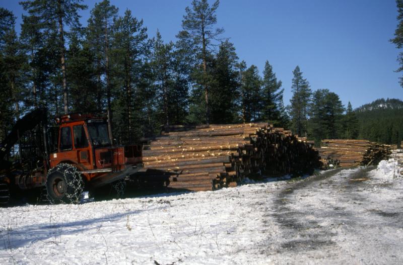 Skogsmaskiner samt upplagt virke ca 500 m från Randi kraftstation.
