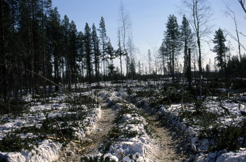 Spåren efter avverkning av skog. Tall, björk och andra träslag.