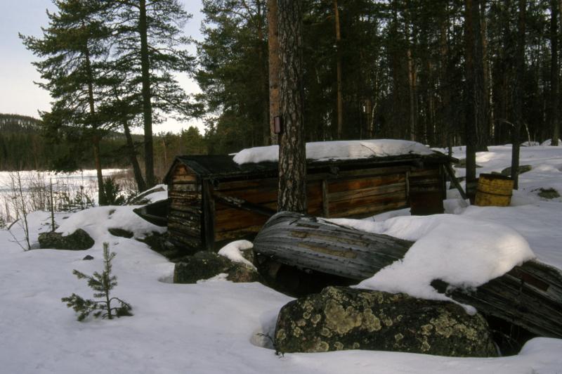 Båthus med gamla båtar i selet mellan Randijaur och Purkijaur. Båtarna användes troligen för timmerflottning, på norra sidan av älven.