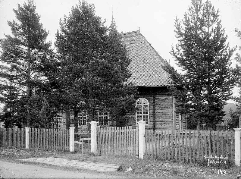 "gamla kyrkan" uppförd 1752- 1753. År 1892 beslöt kyrkostämman (nya kyrkan hade tagits i bruk) att ingå till KMT med begäran att få riva gamla kyrkan vars väggar och innanrede icke innehöll någonting alls av antikvariskt värde; KMT medgav 20/10 1892 rivning och 26/12 1893 beslöt kyrkostämman att kyrkan och klockstapeln skulle säljas till högstbjudande för rivning före 1/7 1894 . Men 25/2 1894 beslöt kyrkostämman upphäva beslut om rivning och kyrkan överlämnade till Jokkmokks Blåbandsförening, som använde denna som möteslokal, men åter lämnades så småningom till församlingen. Klockstapeln revs (troligen 1894) sedan klockorna väl överflyttats till nya kyrkan. 1891 såldes gamla kyrkans inventarier till Nordiska Museet för 10 kr. nämligen: sparbössa av järn och mässing, 4 väggtavlor med sköld (en från 1703) gamla altartavlan i sakristian, gammalt timglas och altarduk av tenn. Vindflöjeln på taket skulle också ingå om kyrkan skulle rivas.