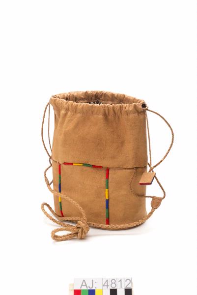 Väska av renskinn, modell med oval botten, två sidostycken, fram- och bakstycke och halsdel. I sömmarna är bitar av dubbelvikt kläde och skinn isytt som passpoaler. Mellan fram-/bakstycke och sidostyckena och mellan fram- och bakstycket och halsdelen: bitar av dubbelvikt kläde i färger: rött, blått, grönt, gult. I sömmarna mot botten och halsdelen är dubbelvikt skinn. Högst upp är skinnet vikt och sytt till en dragsko. Igenom den är en tvinnad skinnrem dragen. Skinnremmen har två tofsar av skinn och rött och blått kläde. Väskan är fodrad med blommigt bomullstyg. Axelrem av fyrflätat skinn, fastsatt mot väskan med tvinnade skinnremmar.