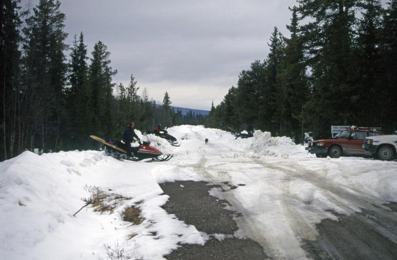 L:25:2000:4:0242 :: vinter, snö, skog, väg, bil, hund, snöfordon, snöskoter
