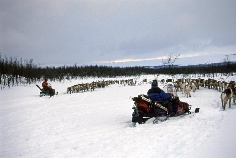 L:25:2000:4:0287 :: vinter, snö, ren, renflock, renhjord, renskötare, snöskoter, snöfordon, skog, björk, flyttningsled