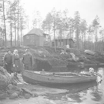 1997:17:01524:A :: sjö, strand, båt, båtlänning, man, kvinna, stuga, uthus