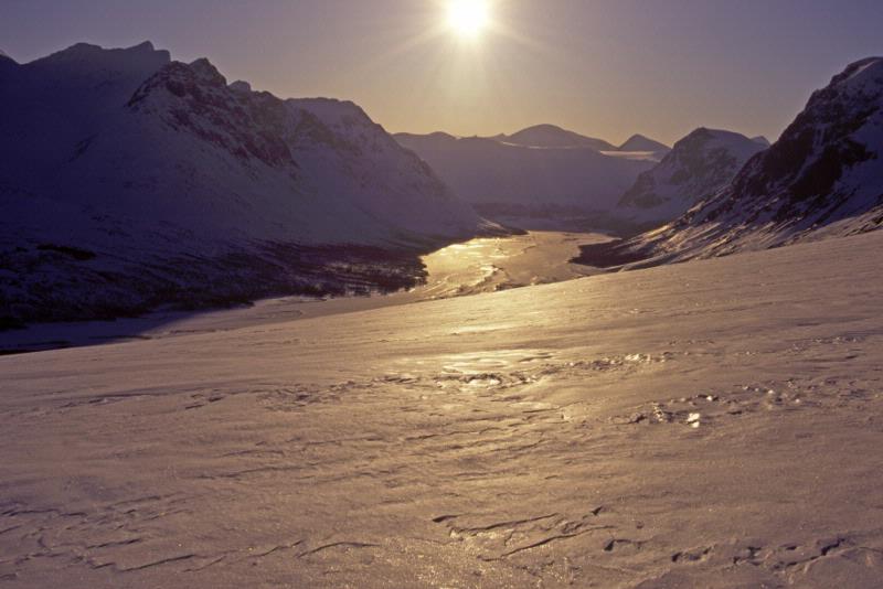 Solnedgång över Rapaselet. Tielma i mitten och Låddebákte till höger.