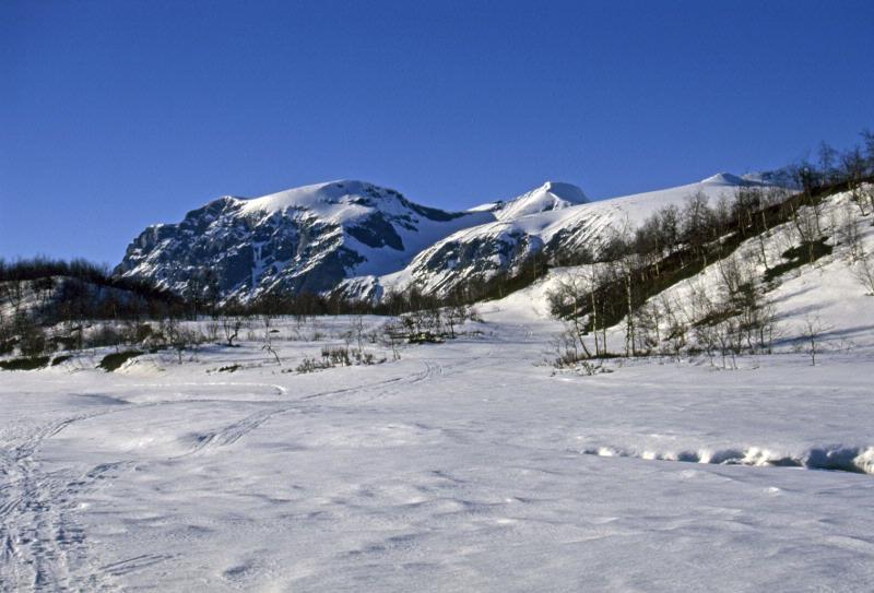 Bilden är fotad nedanför Rapaselet. Fjällen heter Stuor Skoarkki och Svirjatjåhkkå.