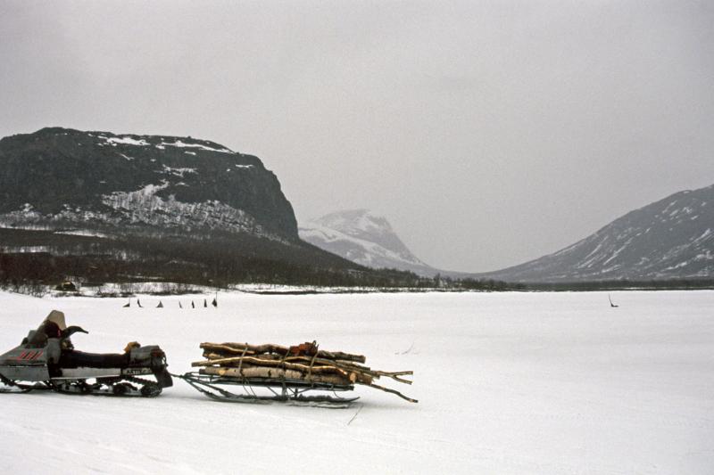 - Skoter med vedlast. I bakgrunden syns ett spärrstängsel med svarta plastsäckarså att renarna inte ska smita förbi den på väg västerut.