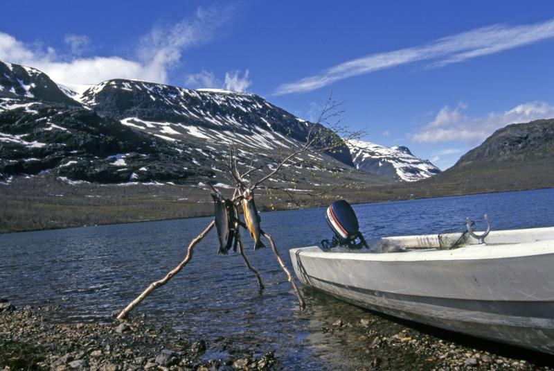 L:25:2000:4:0606 :: fjäll, fjällnatur, dal, dalgång, landskap, natur, sjö, fisk, båt, båtutrustning, ställning