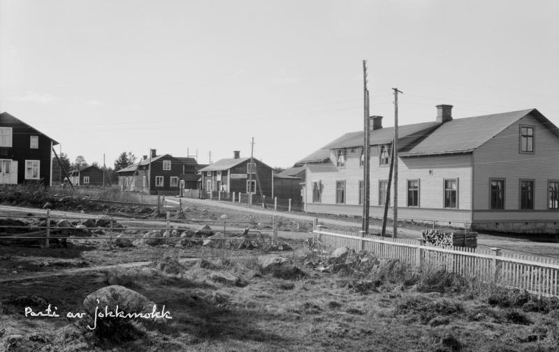 parti av Jokkmokk. Parti av Åsgatan. Huset längst t.h. är tingshuset, uppfört 1903, byggnaderna t.v. därom, uppförda 1896 var Frölunds affär (bageri och kafe') nu rivna. Tingshuset revs 1969 för att ge plats åt nya Förvaltningsbyggnaden. Byggnaden därefter på samma sida av gatan är uppförd på det s.k. Länsmanskvarteret nu riven, var tidigare uppförd på den plats där Nya kyrkan byggts. Till vänster Sandkvists gård.
