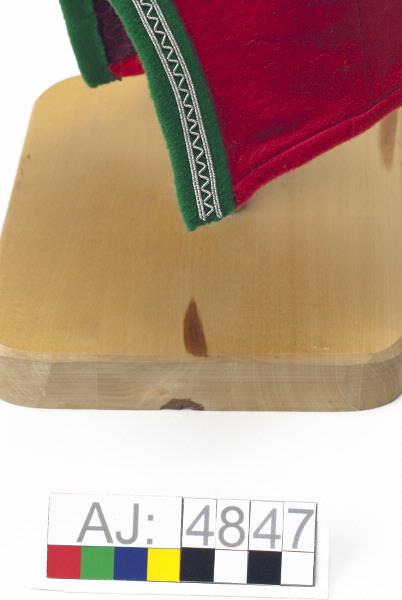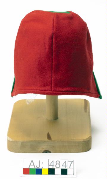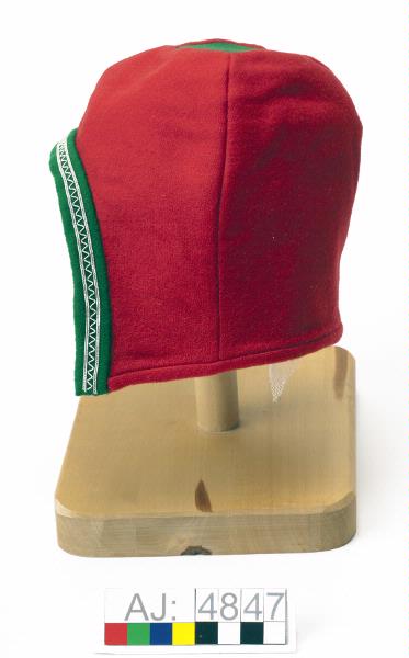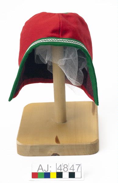 - Flickmössa i rött kläde med en rundel av grönt kläde som dekoration högst upp och framtill. Det är tennbroderat på det gröna fältet runt ansiktet; ett zig-zack mönster med två raka längder på var sida. Fodrad med mönstrat bomullstyg.