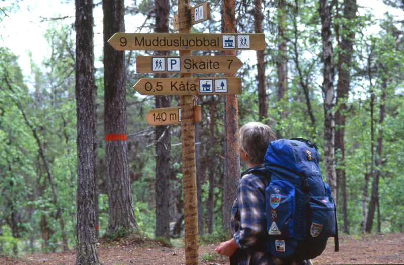 Muddus. Skyltar vid fallstugan med turist