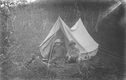 gustav Hamberg och Wille Länta vid Litnokhyddan i Rapadalen A. H. omkring 28 juli 1921. Tillägg 2008-06-13 av Anne Maj Johansson Backteman, pilar under bilden visar att Wille Länta sitter till vänster och Gustav Hamberg till höger