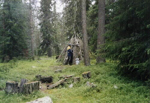 4:35 Ängesån Turpas, gammalt sommarviste med näverkåta och mjölkningshage, näverkåta av brädor
