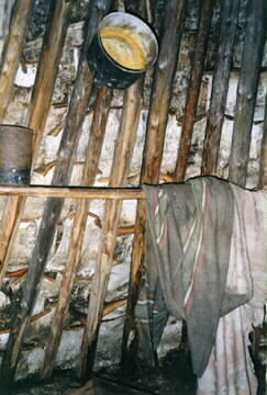 AJF:20:000116 :: näverkåta, kåtainteriör, rundvirke, grytås, gryta, filt