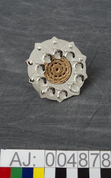 Brosch av silver och björkrot. Cirkel av silverplatta med graverat mönster och med 10 hängande löv. I centrum/mitten av broschen är en bunden rund platta av björkrot.
