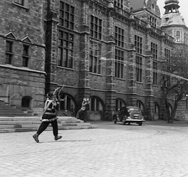 samernas Folkhögskolas elever, vinterkursen 1949-1950. Ur REDOGÖRELSE FÖR SAMERNAS FOLKHÖGSKOLA 1949-1950: april 28. Rundvandring på Nordiska Museet, hela gruppen på temottagning hos ambassadören B. Bergersen. På kvällen medverkade eleverna med tal och sång samt lassokastning vid Svenska Missionsällskapets sameafton i Kungsholmens församlingssal. En av pojkarna bär ett renhorn, eventuellt i samband med lassokastningen