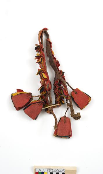 Grimman av barkgarvat skinn, rikt prydd med röda, gula och blå tyglappar, av kläde. Skinnet dekorerat med kläde och sicksackband. Fyra tofsar av kläde. Grimlås/knapp av renhorn, graverad med mönster och ägarbokstäver.