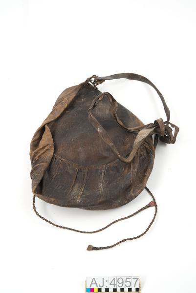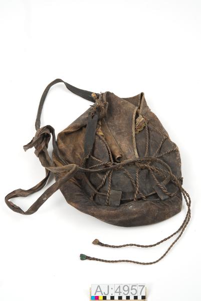- Ryggsäck av skinnn med fram-, botten och baksida som viks över till lock. Mellanlägg av dubbelvikt skinn i sömmarna. Öppningen är dekorerad med en röd och gul klädesremsa. Locket kantat med skinn. I locket är två knytsnoddar av tvinnat skinn fastsydda. I ändarna är rester av tofsar av rött och grönt klläde. Bärband, utskuret i läder, sitter fast upptill vid rygg och är draget genom två skinnremsor fram.Sex öglor av tvinnade skinnremmar fastsatta i sömmen mellan framstycke och botten