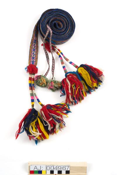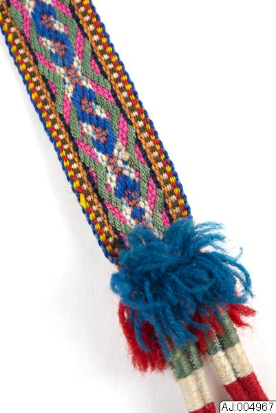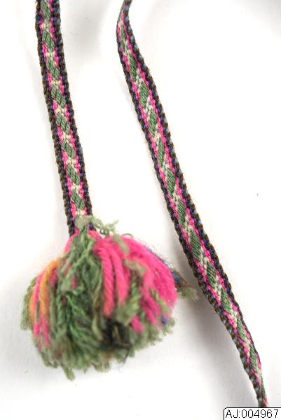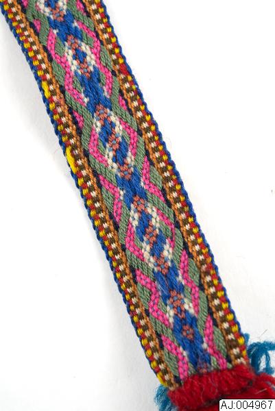 Vävt lulesamiskt bälte med två tofsar i var ände. Vävt med fritt mönster i mitten och kantsmönster (suollu). Det fria mittenmönstret i färgerna rosa, grönt, vitt, blått, orange. Där bandet knyts kring midjan är det fodrat med svart vadmal, i ena änden en ögla av vitt skinn och i andra ändan två vävda knytband ( bredd 0,7 cm;längd ca 24 cm med tofsar).