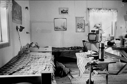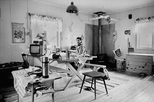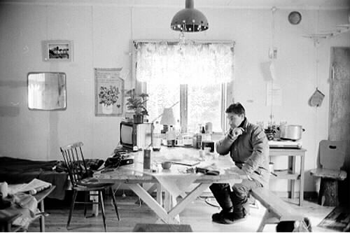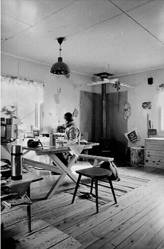 1996:33:448:A :: renvaktarstuga, renflyttning, inredning, möbler, TV, kamin, köksbord, säng, renskötare