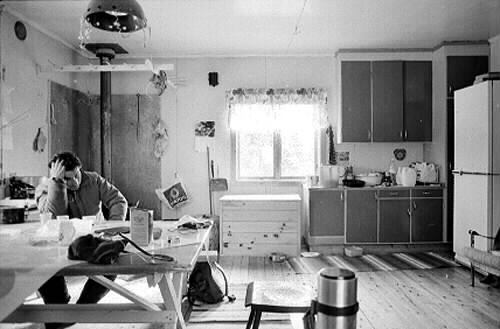 Renflyttningen-96. Kielatis/Vannar- och Utsis vintergrupp. Sirkas sameby. Interiörbilder från renvaktarstugan i Sarkavare.