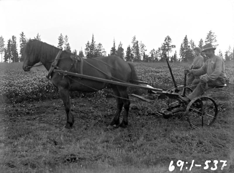häst, hästtransport, hästutrustning, slåttermaskin, slåtter, slåtteräng, bonde