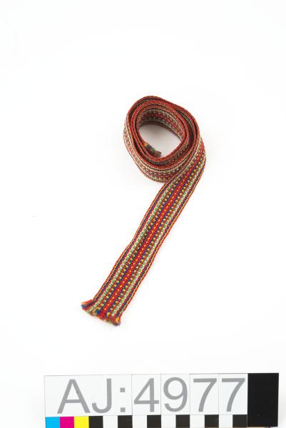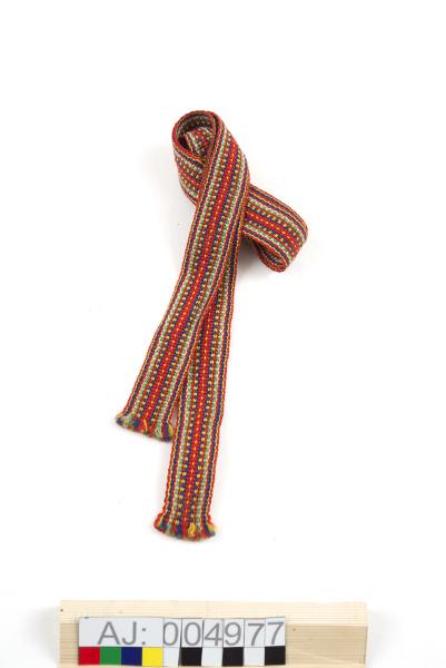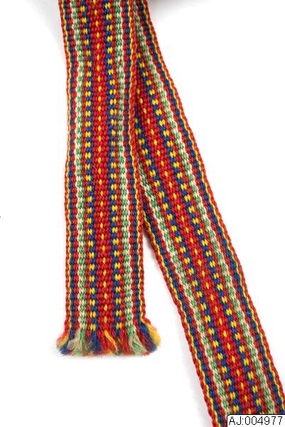 Slips vävd av ullgarn. Slipsen är smalare i mitten, dvs. där den ska knytas runt halsen. Länsgående randmönster. Kanterna av rött garn. Mönstret är från vardagsskoband för man från Gällivare/Jukkasjärvi, njuolggovuoddagat. De används framförallt i Gällivare och Jukkasjärvi, men har också förekommit i Karesuando. (Källa: Susanna Jannok Porsbo: Samiskt dräktskick i Gällivare, Jukkasjärvi och Karesuando socknar. Ájtte 1988.)