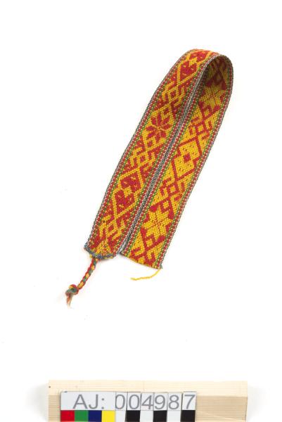 Vävt band med med röda mönsterfigurer på gul botten. Kanterna i grönt, gult,rött, vitt och blått garn. 4 cm av garča/knytbandet finns kvar, flätat av gult, rött och grönt garn.