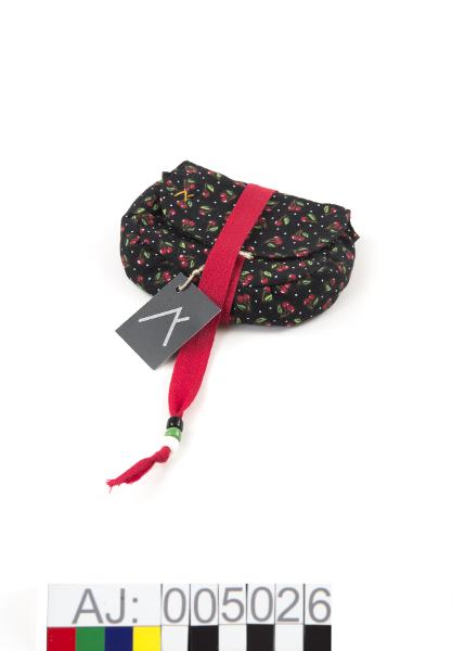 Liten väska av småblommigt bomullstyg, mönstret på svart botten. Väskan i modell samisk syväska med bottendel rynkad mot fram- och bakstycke. Väskan har lock, tillklippt ihop med bakstycket. Väskan är fodrad med svart bomullstyg. Framtill är en röd dubbel tygbit för att fästa nålar i. I locket är ett rött maskinvävt bomullsband fastsytt att linda runt väskan för att stänga den. Längst ut på bandet sitter tre plastpärlor; en svart, en grön och en vit.