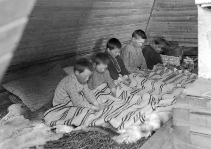 Barn ber aftonbön, nomadskolan i Vaikijaur. Träsovkåta, slutet av 1920-talet