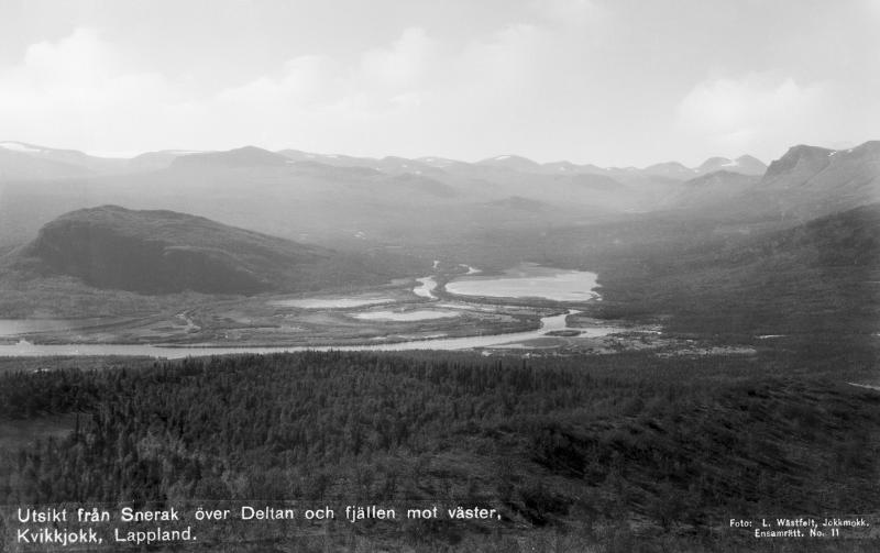 utsikt från Snjerak, över deltan och fjällen mot väster, Kvikkjokk, Lappland