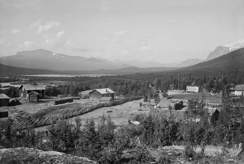 utsikt från stigens början upp till Snjerak lågfjäll över vallen vid Börje Danielssons t.v. och Manne Stenmans t.h. fjället Vuoka t.v. och Kaskaivo t.h.
