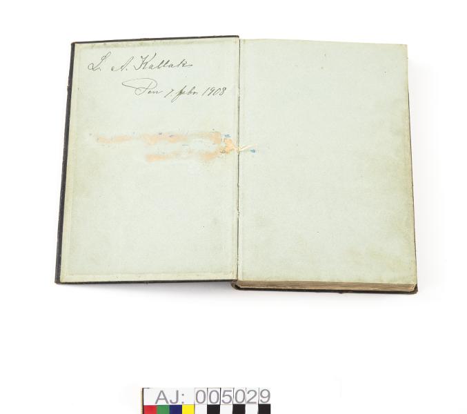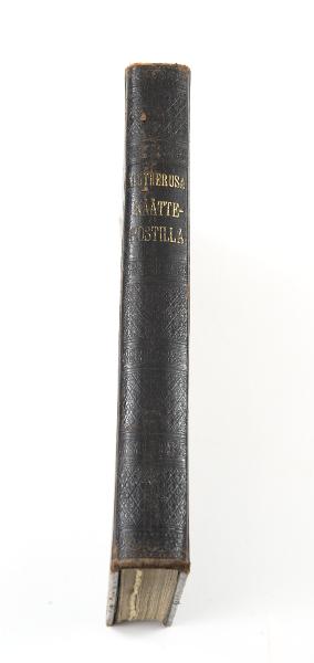 AJ 5029:1 postilla, boken Lutherusa Kååttepostilla, tryckt 1893. Inskrivet på pärmens insida: "L.A. Kallak Den 1 feb 1908." Svart skinnband. Mönster punsat (stansat) i skinnet på framsida, baksida och rygg. På ryggen är boktiteln med gulbokstäver. Skriften är frakturstil. Höjd: 22,1 cm, bredd: 15,5 cm, tjocklek: 2,8 cm.