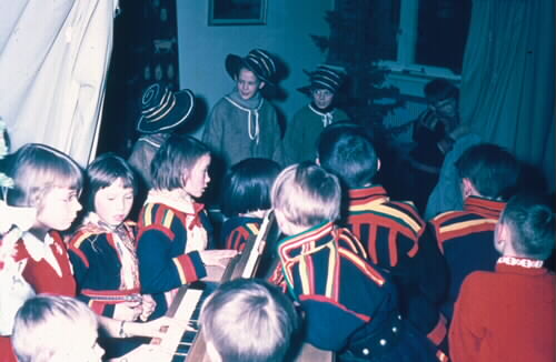 1986:8:00460:D :: skolklass, barn, teaterföreställning, nordsamisk dräkt, jukkasjärvisamisk dräkt