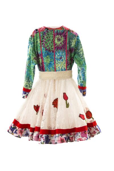 AJ 5030:1 nordsamisk kvinnokolt av blommiga tyger och spetstyg. Kolten är avskuren i midjan. Upptill blommigt, kroppen på turkosblå botten, axelok på röd botten. Dekorationer med rött kläde, rosa tyg och glitterband. Kjoldelen av vitt, spetsmönstrat tyg med applikationer i form av röd tulpaner med gröna stjälkar och en volang av blommigt tyg. Tygerna är "återvunna" tyger, dvs. gardiner inköpt på sekond hand- butik.