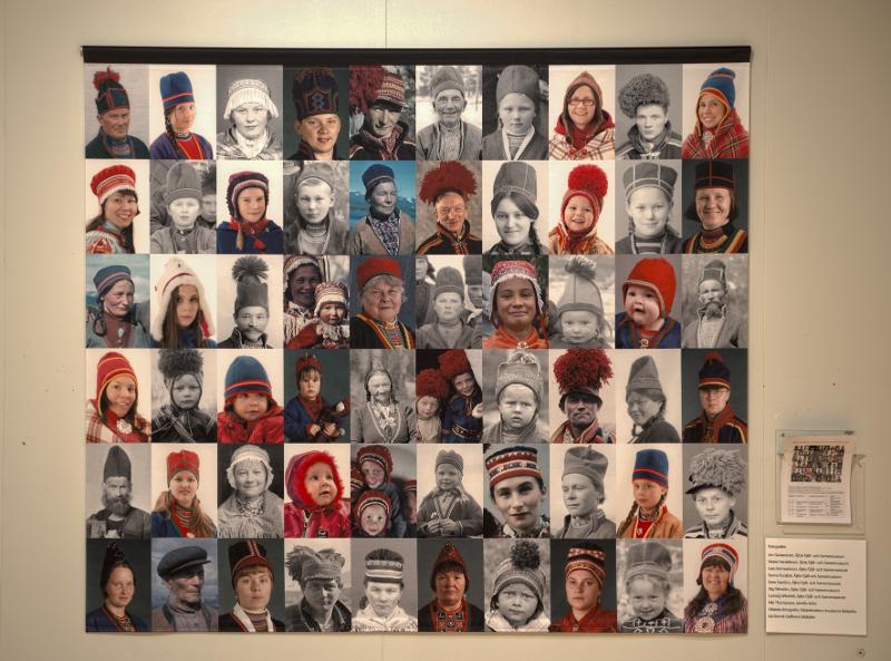 Vepan visar porträttfoton av samer från nord-, lule- och sydsamiskt område som bär traditionella samiska mössor eller mössor inspirerade av de traditionella samiska mössorna.