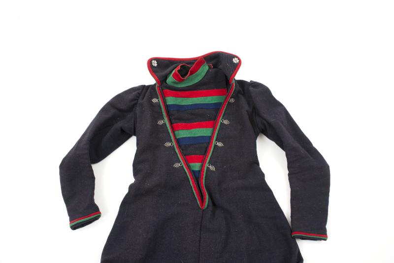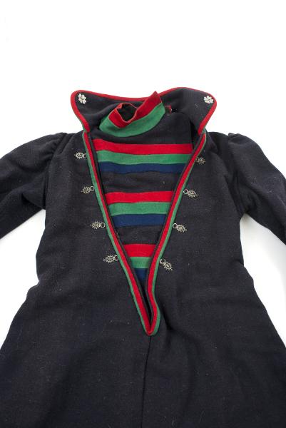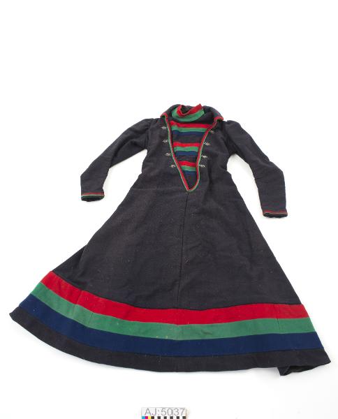 Svart ylletyg med dekoration av rött, grönt och blått kläde på krage, i v-ringning, i ärmslut och i koltens nederkant. Innanför v-ringningen är ett barmkläde fastsytt på ena sidan, med ränder av svart ulltyget och rött, grönt och blått kläde.