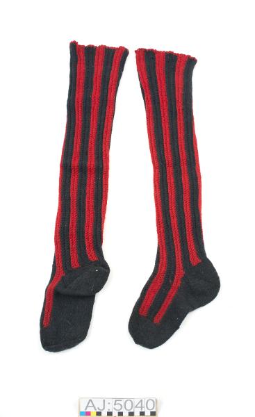 AJ 5040:1-2 ett par högskaftade virkade strumpor. Strumporna är röd och svart-randiga, ränderna går längs med benen.