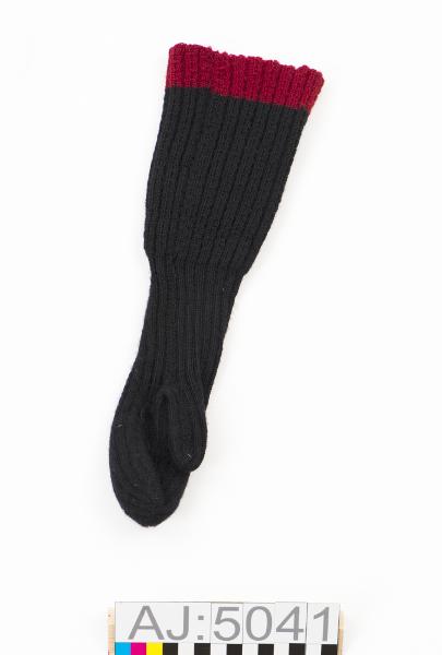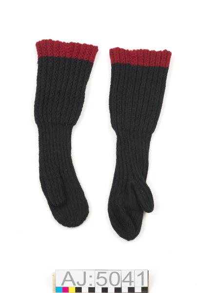 AJ 5040:1-2 ett par långa maskinstickade vantar. Svarta med mönsterstickadde långa muddarmed röd kantbård.