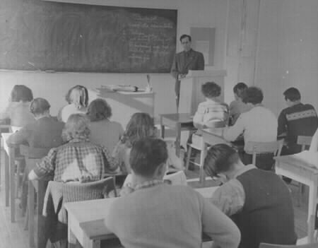 Samernas%20Folkh%C3%B6gskolas%20elever%2C%20vinterkursen%201948-1949.%20Skolarbetet.%20Lennart%20Wallmark%20h%C3%A5ller%20lektion